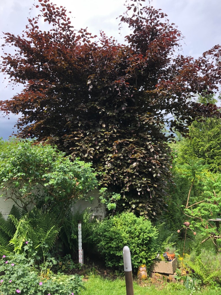Avant que les feuilles n’éclatent dans leur couleur de hêtre pourpre, un pigeon s’est posé sur une des branches après un vol plongeon à partir du frêne du fond du jardin.