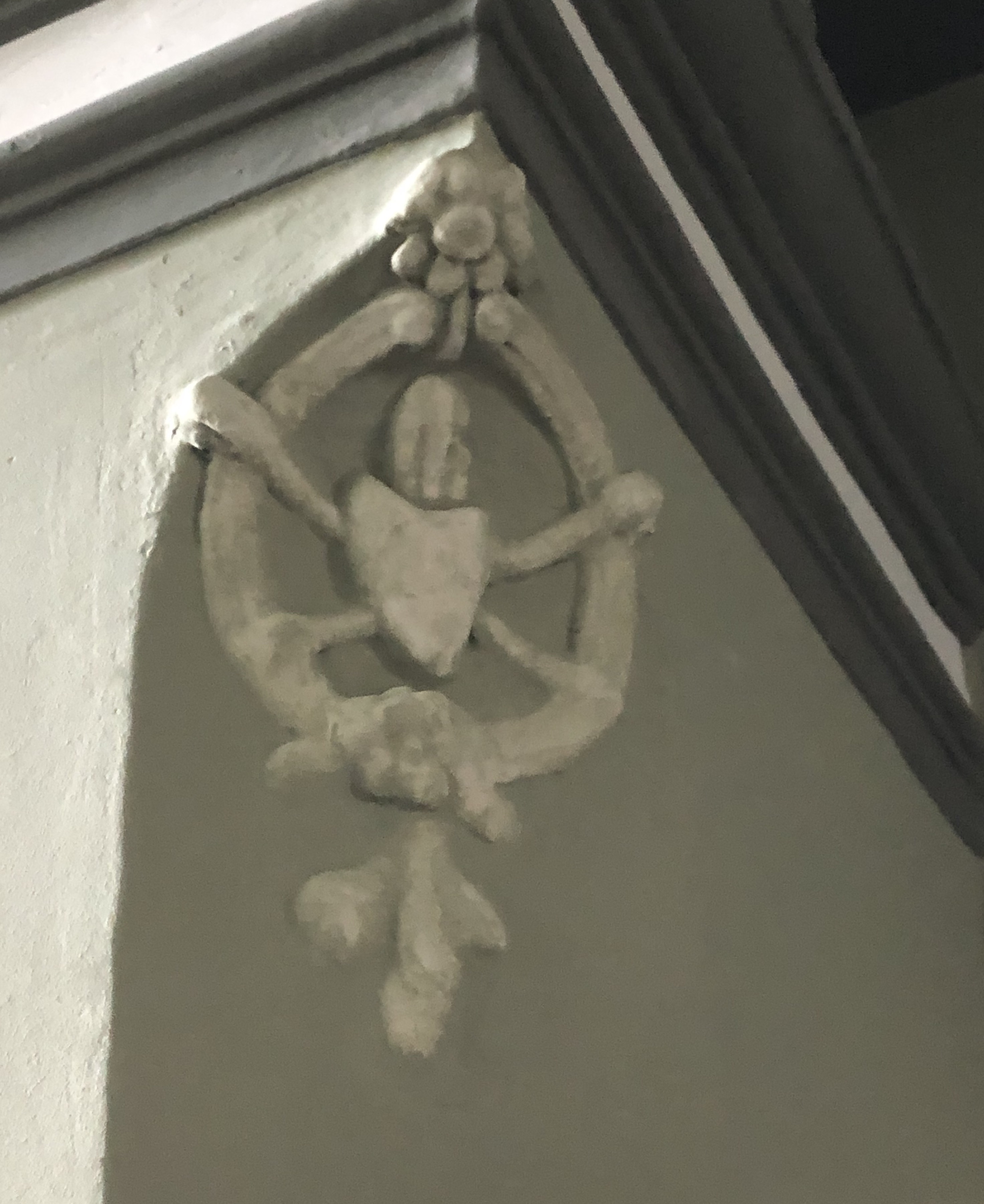 Est-ce pour cela que dans ma méditation, au bout de la nef en attendant l’organiste, je l’ai à mon tour découvert, oui là au-dessus du maître d’hôtel, dans la décoration symétrique, en chapeau. Je ne vois plus une corne d’abondance comme je le voyais précédemment, j’y vois à présent, des paons, imaginés, vus, interprétés. L’un à gauche, l’autre à droite et pourquoi pas.