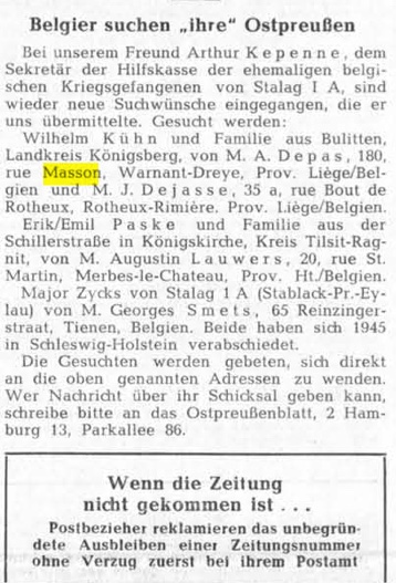 Suite à l’adresse du stalag II B – A.K.842 à Hammerstein retrouvée derrière une photo de famille, et une recherche d’information sur Internet, le message suivant a été trouvé dans le journal « Ostpreussenblatt ».