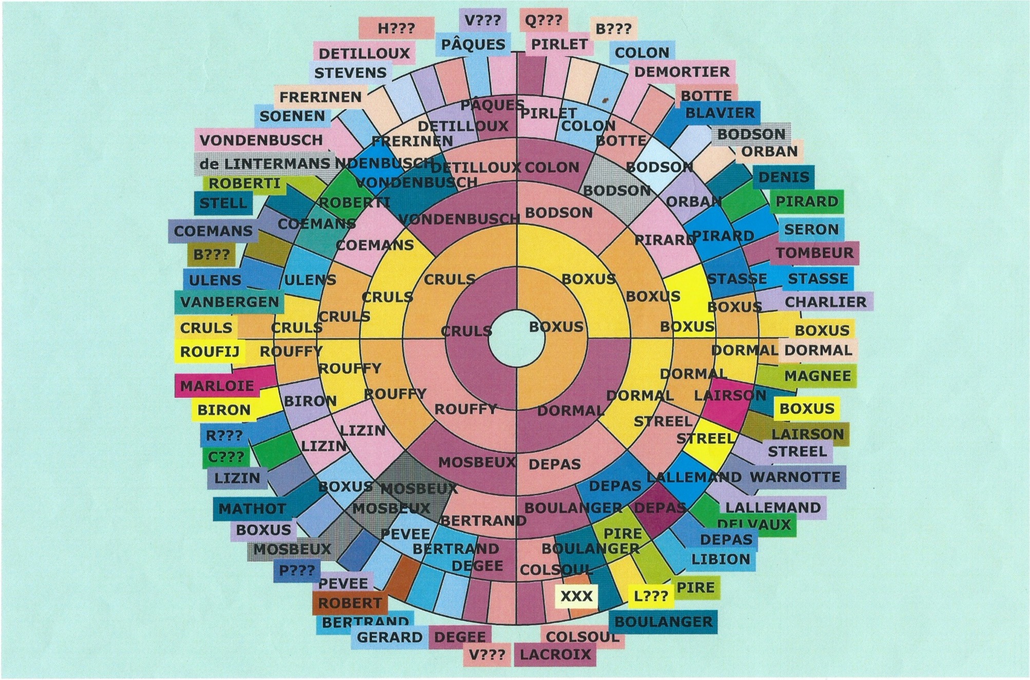 Comme un seuil franchi permet d’entrer dans un autre espace de vie, une autre dimension, une présentation graphique différente se proposa à la place de la pyramide; le dessin par anneau.Mon schéma dernier né, plus parlant que celui des quartiers, représente me semble-t-il, une image neutre de la réalité où mes lignées peuvent trouver leur place. Partant du centre et par anneau vers l’extérieur, par les différents mariages scellés entre mes ascendants les générations présentes sur le dessin m’entourent.Chacun y a sa place, en tant que géniteur ou fantôme dans le théâtre de ma vie. En voyant ce dessin de loin l’image de la roulette d’un jeu de hasard s’impose. C’est une matrice d’où, une à une les caractéristiques qui me constituent ont été jouées. Hérédité Cette métaphore me plait plus que l’histoire des haricots de Mendel qui faisait le délice de mon père au moment où il essayait de nous expliquer l’hérédité.Hérédité poids qui le travaillait quand il voyait apparaître sur le front de ma soeur une trace rougeâtre sous-jacente à certains moments et qu’il nous disait ; « Regardez, c’est une trace de la vieille, c’est la même marque qu’elle » . Ligne légère que porte ma fille discrètement à certain moment.